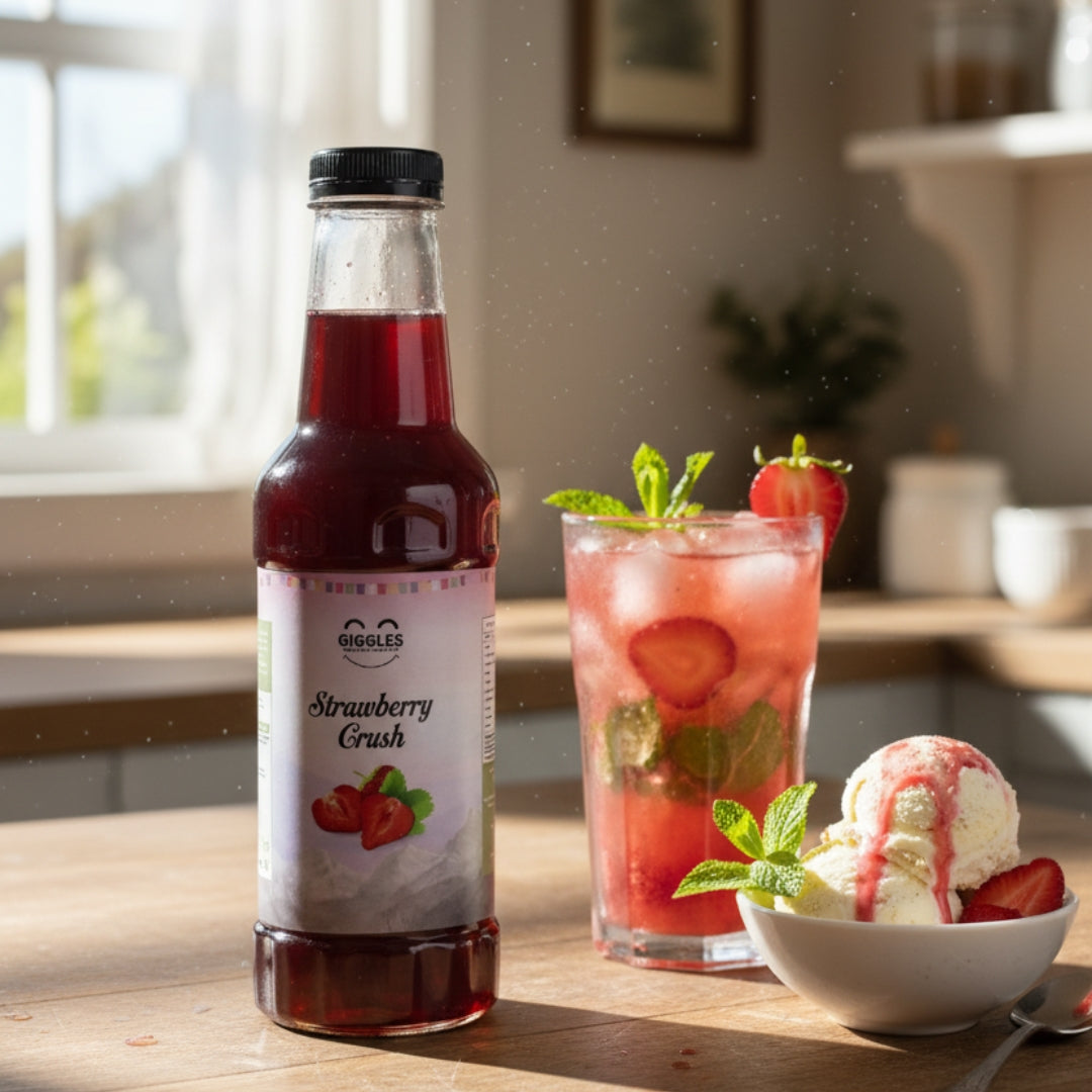 Giggles Strawberry Crush brings you the sweet, juicy flavour of real strawberries in a smooth, vibrant red syrup. Perfect for milkshakes, smoothies, sodas, mocktails, ice creams, desserts, and bakery use — this crush adds both colour and flavour to any recipe.