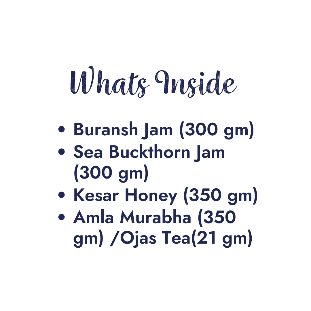 Celebrate Diwali with our curated special hamper featuring four premium products: 300g Buransh Jam, 300g Sea Buckthorn Jam, 350g Kesar Honey, and your choice of 350g Amla Murabha or 21g Ojas Tea. Priced at ₹1350, this hamper offers a perfect blend of health and tradition, making it an ideal gift to share warmth and wellness during the festive season.